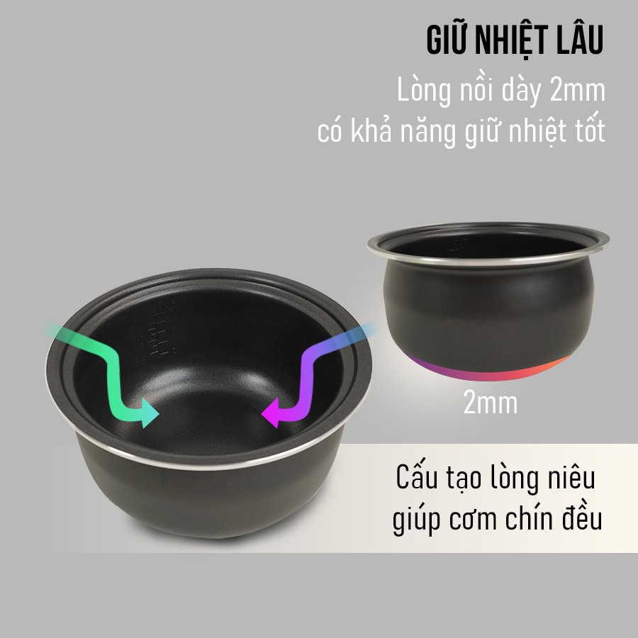 👉 Lòng nồi có độ dày 2mm giúp truyền nhiệt nhanh và đều giúp cơm chín kỹ, dẻo thơm như nấu bằng bếp củi.